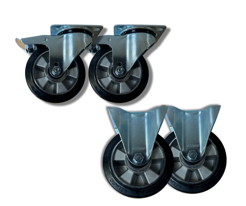 Komplet obejmuje cztery koła: dwa stałe oraz dwa skrętne z hamulcem. Solidna, wytrzymała konstrukcja sprawia, że to rozwiązanie idealne do codziennego i intensywnego użytkowania.